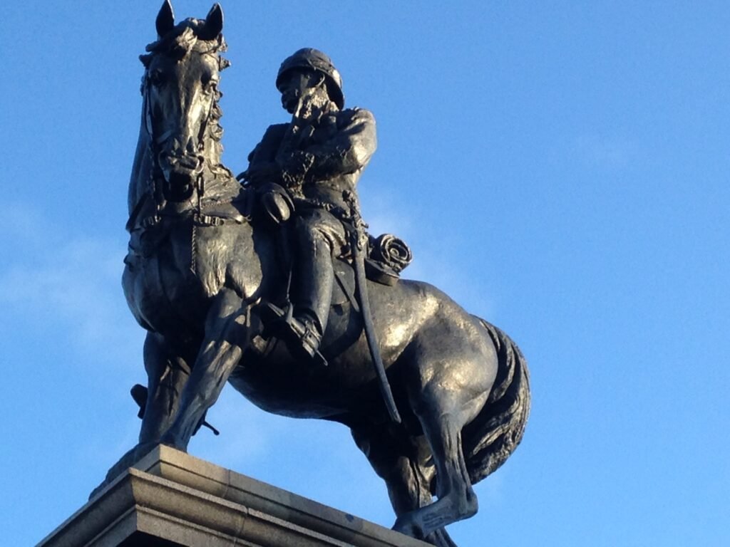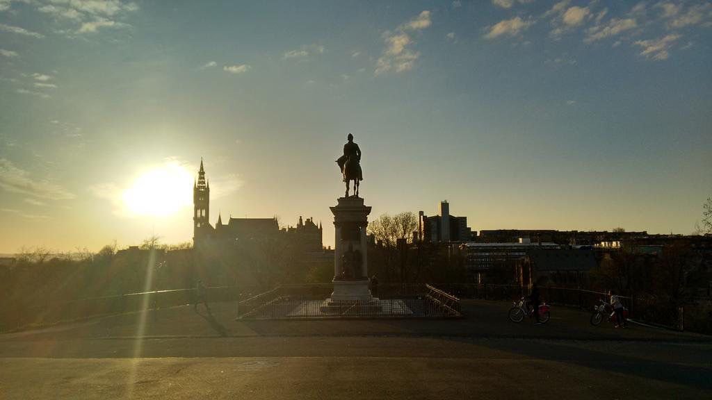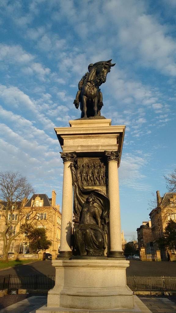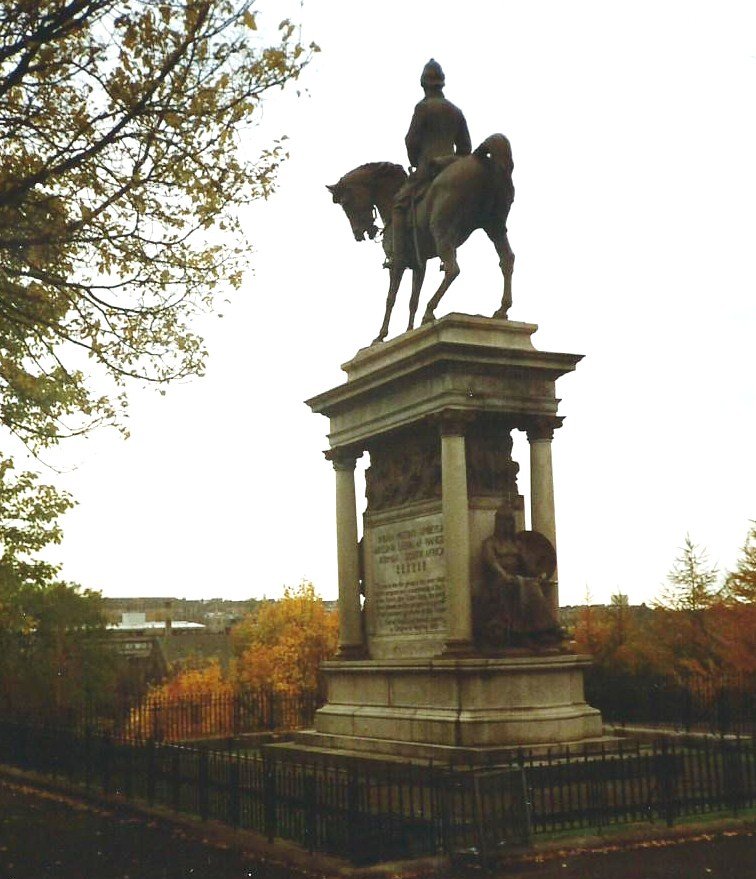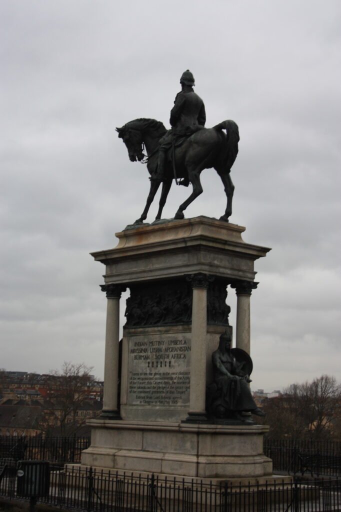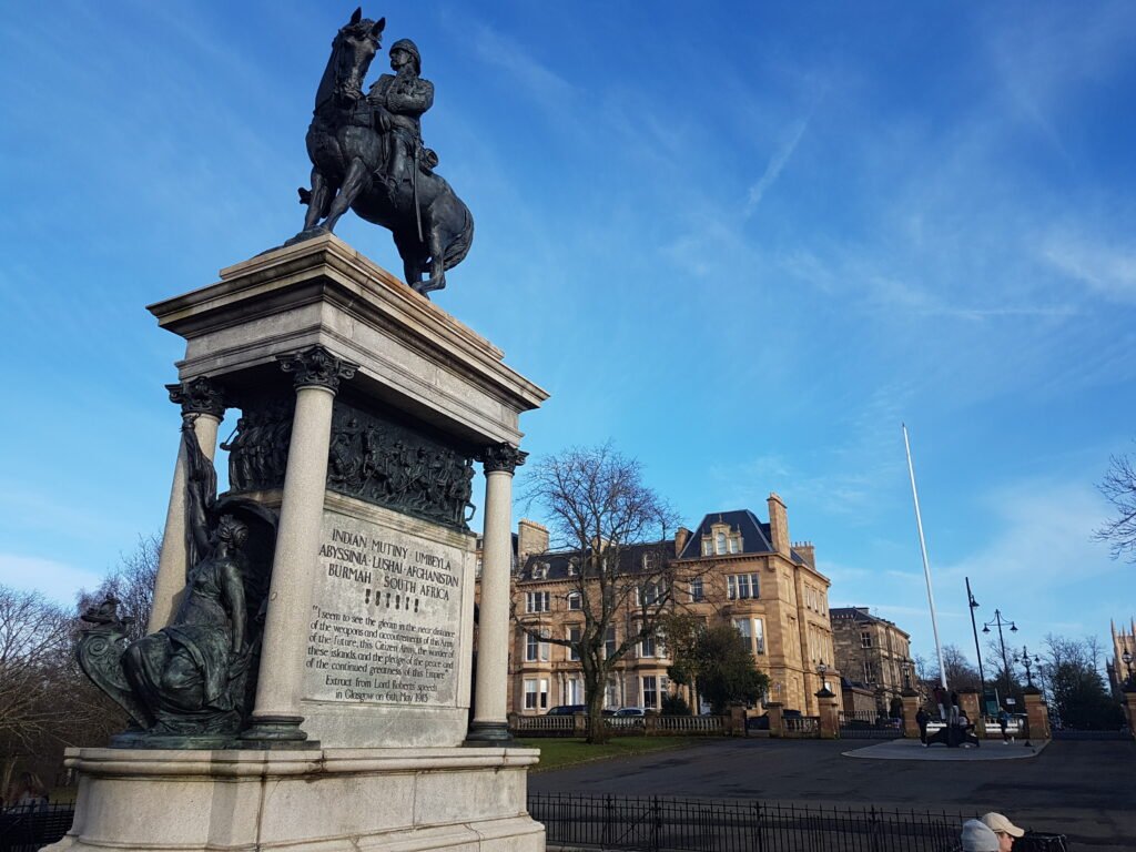 The Earl Roberts statue in Kelvingrove Park is a Category A–listed bronze equestrian monument (unveiled 1916) set on a grand granite architectural pedestal with relief panels and seated figures of War and Victory.